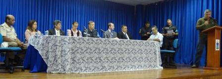 Na mesa do Café Comunitário estavam: Luiz Carlos Dentinho, do jornal Correio da Zona Oeste (ao microfone); o Comte. do Grupamento de Trânsito da GM, Reinaldo Rangel de Oliveira; a representante da OAB/Campo Grande, Viviane Tomazinho; o Vereador Edson Zanata; a presidente do Conselho Comunitário, Lilia Vieira; o Comte Chagas; vice-reitor UEZO; Reitor UEZO e o representante da 35ª DP, Ricardo José.