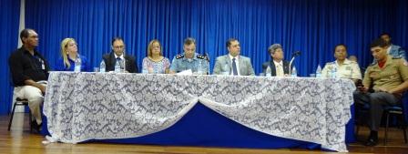 Participaram da mesa do encontro: (E/D) o coordenador da 9ª CRE, José Mauro da Silva; a membro da OAB/RJ 29ª Subseção Campo Grande, advogada Jane Mazzal; o Delegado Titular da 35ª Delegacia de Polícia, Marcus Druker Brandão; ; a presidente do Conselho Comunitário de Segurança, Lilia Vieira; Comandante do BPM; o Reitor UEZO; o Vereador, Edson Zanata; e representações da Guarda Municipal, do Corpo de Bombeiros.