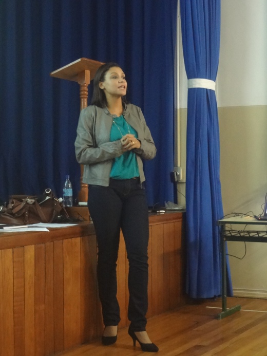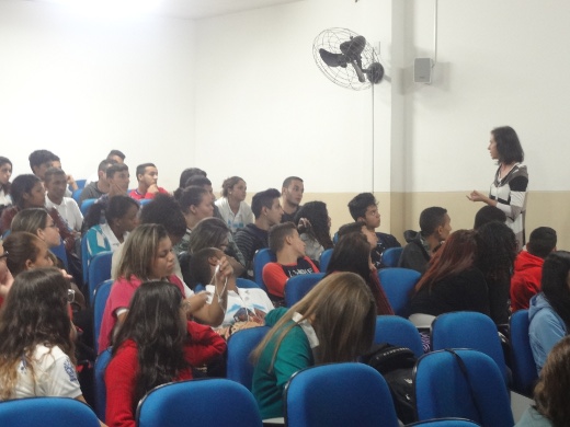 Esther Benatti falando com os alunos. |  Flávia Ribeiro contando suas experiências para a platéia. |