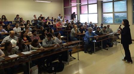 As alunas e a professora na primeira fila da audiência. Da esquerda para a direita, Rohanna é a primeira (de óculos), Raissa a 3a (com os braços em cima da mesa) e a prof Maria Rita é a 5a. pessoa, na ponta.