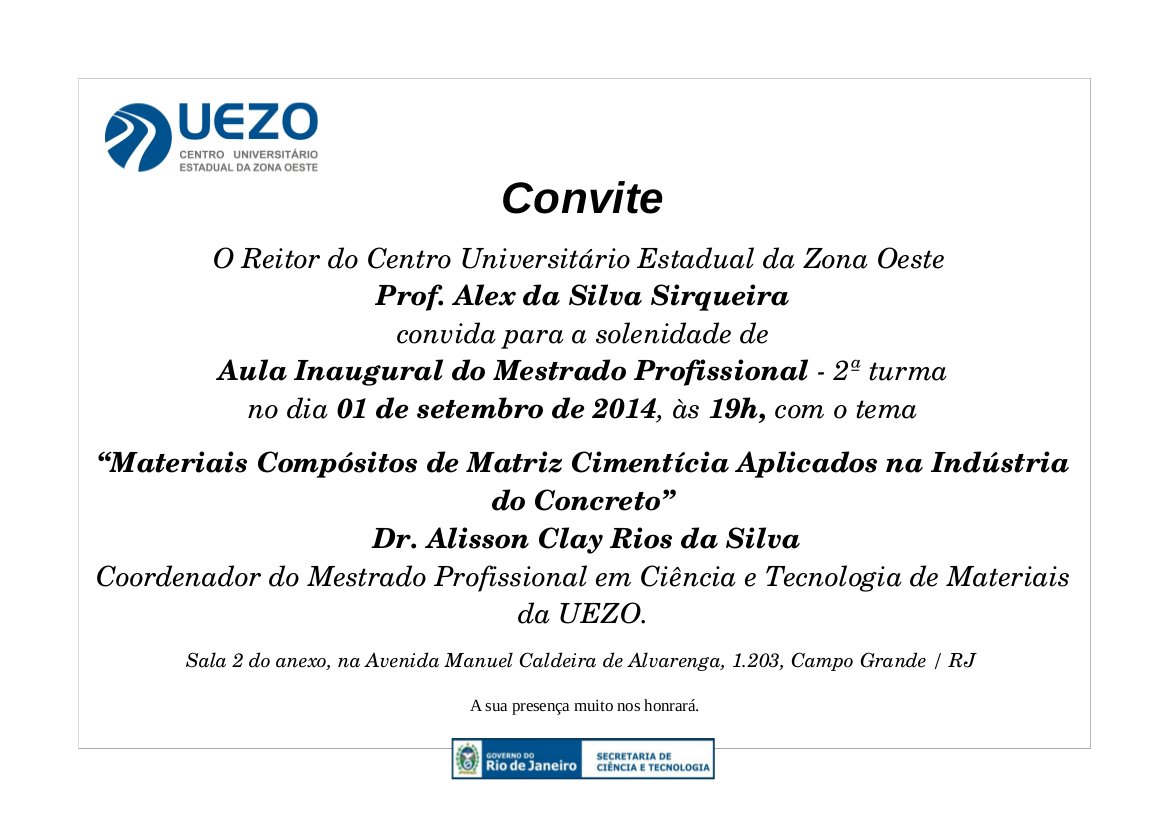 Na próxima segunda-feira, 01/09, às 19h, o coordenador do Mestrado Profissional em Ciência e Tecnologia de Materiais da UEZO, prof. dr. Alisson Clay Rios da Silva, proferirá a aula inaugural do curso.