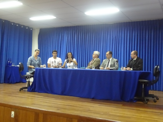 Patrícia Palmeira (representante dos laboratoristas), Nilton Felipe (representante discente), Edna Valotta (presidente da ADUEZO - Associação dos Docentes da UEZO), Comte Bittencout (deputado), Alex Sirqueira (Reitor) e João Bosco de Salles (Vice-Reitor) compõem a mesa da Audiência Pública.