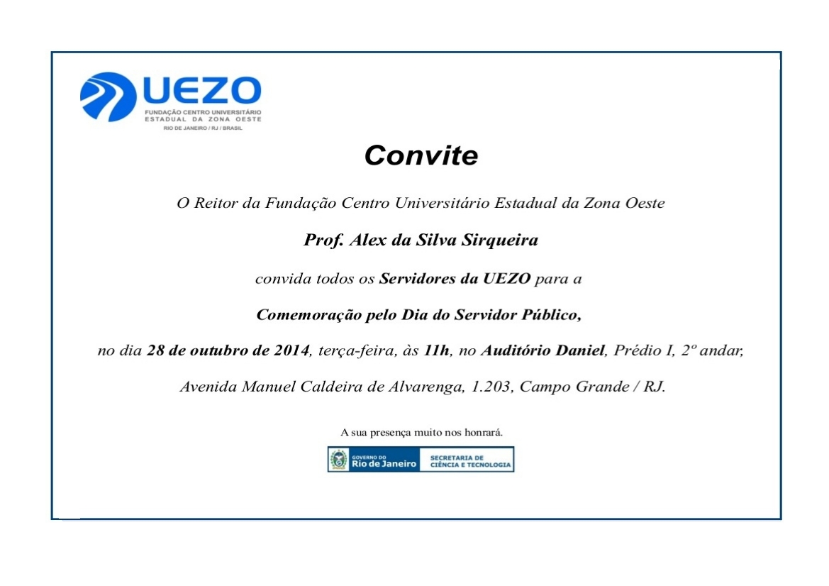 Para celebrar a data de 28 de outubro, Dia do Servidor Público, será realizado um evento no Auditório Daniel, às 11h. Confira abaixo o convite, voltado para os servidores da UEZO.