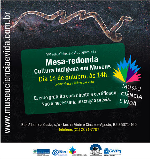No dia 14 de outubro, às 14h, o Museu Ciência e Vida promoverá uma mesa-redonda sobre cultura indígena em museus. O evento, que faz parte da mostra “Astronomia Indígena: Céu Ticuna e Céu Tupi-Guarani”, contará com a presença das antropólogas Deise Lucy Oliveira Montard (UFAM), que abordará a cultura Guarani, e May Anielly Metchi'ena Moura da Costa, representante da etnia Ticuna e mestranda em Antropologia Social (UFAM), que falará sobre a celebração Ticuna conhecida como “Festa da Moça”. A mediadora do debate será a antropóloga Priscila Faulhaber Barbosa, da Coordenação de História da Ciência do Museu de Astronomia e Ciências Afins (Mast).
