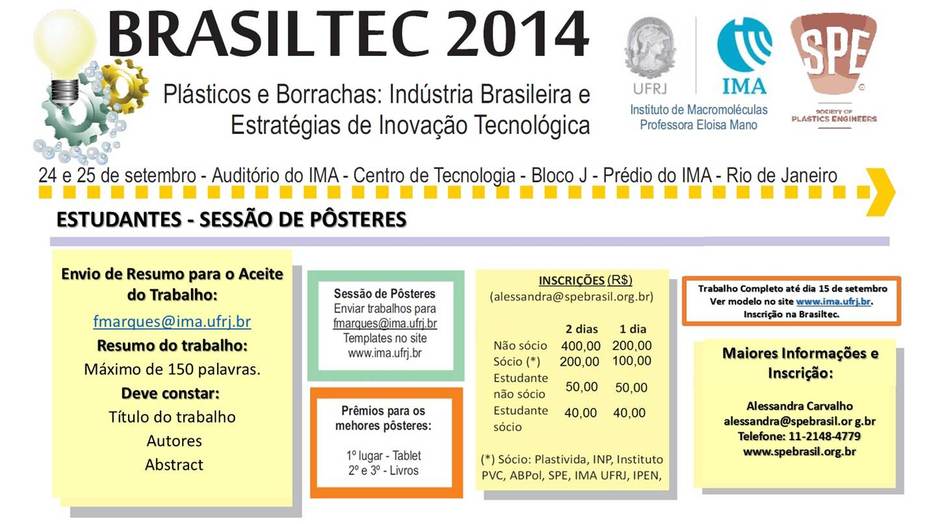 O Instituto de Macromoléculas - IMA/UFRJ convida a comunidade acadêmica da UEZO para participar da Brasiltec 2014, nos dias 24 e 25 de setembro, no CT- Bloco J-Cidade Universitária, na Ilha do Fundão,
