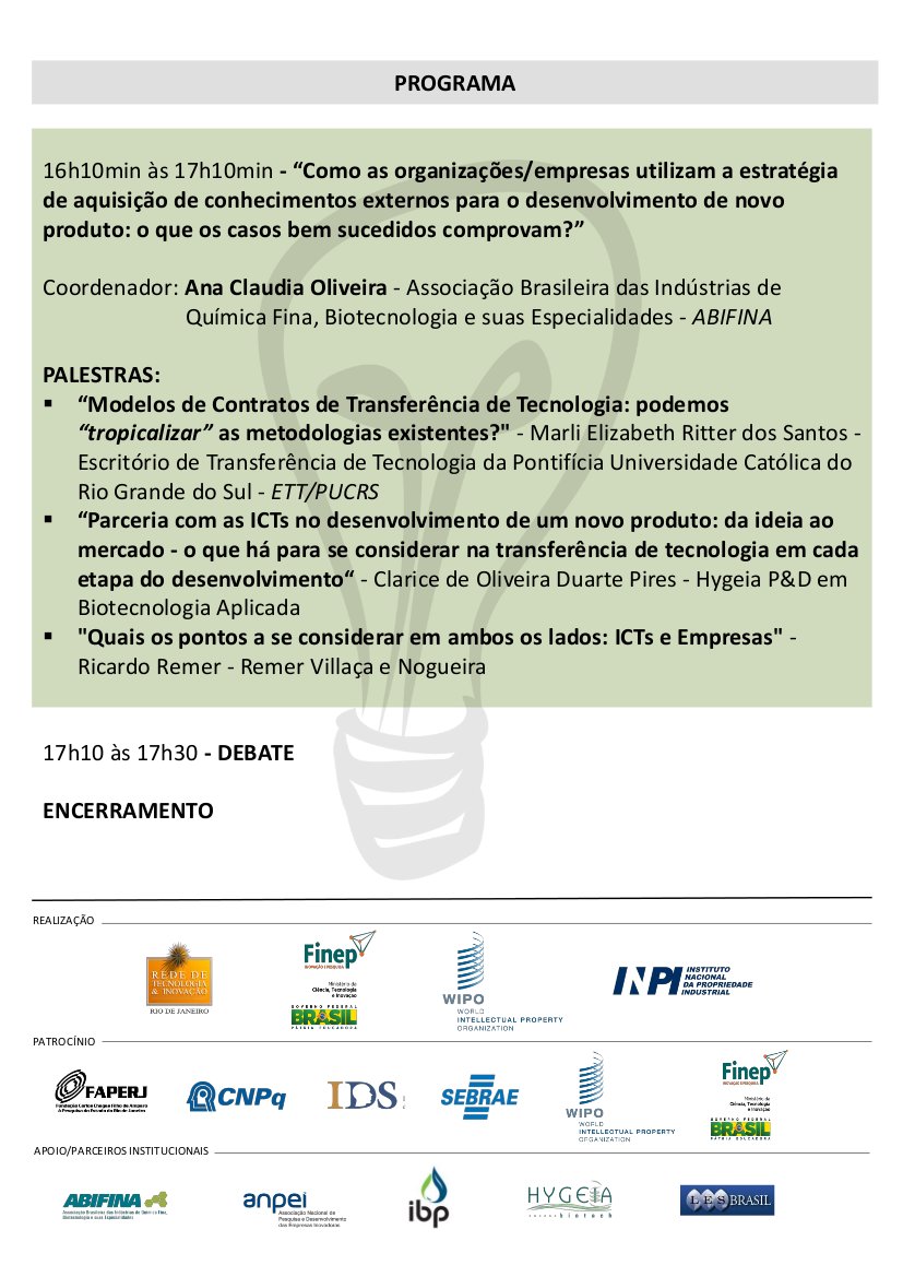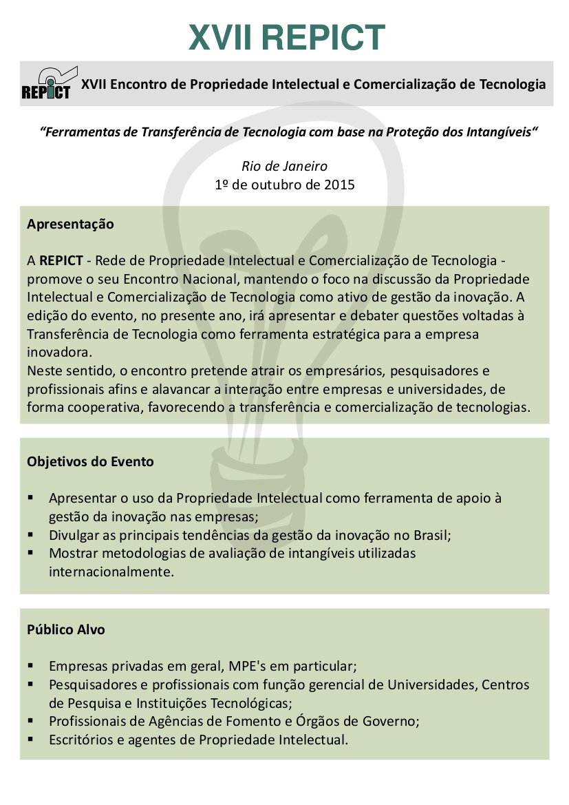 Estão abertas as inscrições para o XVII Encontro de Propriedade Intelectual e Comercialização de Tecnologia (REPICT). Este ano, o tema do encontro será “Ferramentas de Transferência de Tecnologia com base na Proteção dos Intangíveis”. O evento acontecerá no dia 1º de outubro, no Rio de Janeiro.