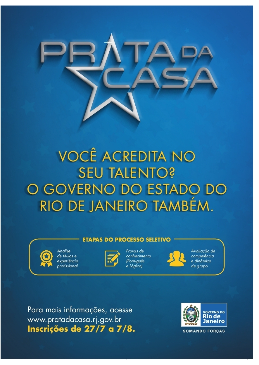Estão abertas, a partir do dia 27/7, as inscrições para o Prata da Casa – um programa de valorização dos servidores efetivos criado pelo Governo do Rio para identificar e dar visibilidade a talentos do quadro de funcionários, por meio de processos seletivos internos. Os interessados podem acessar a página do programa (www.pratadacasa.rj.gov.br) até 07/8 – último dia de inscrição. O edital contendo todas as regras também está publicado no site.
