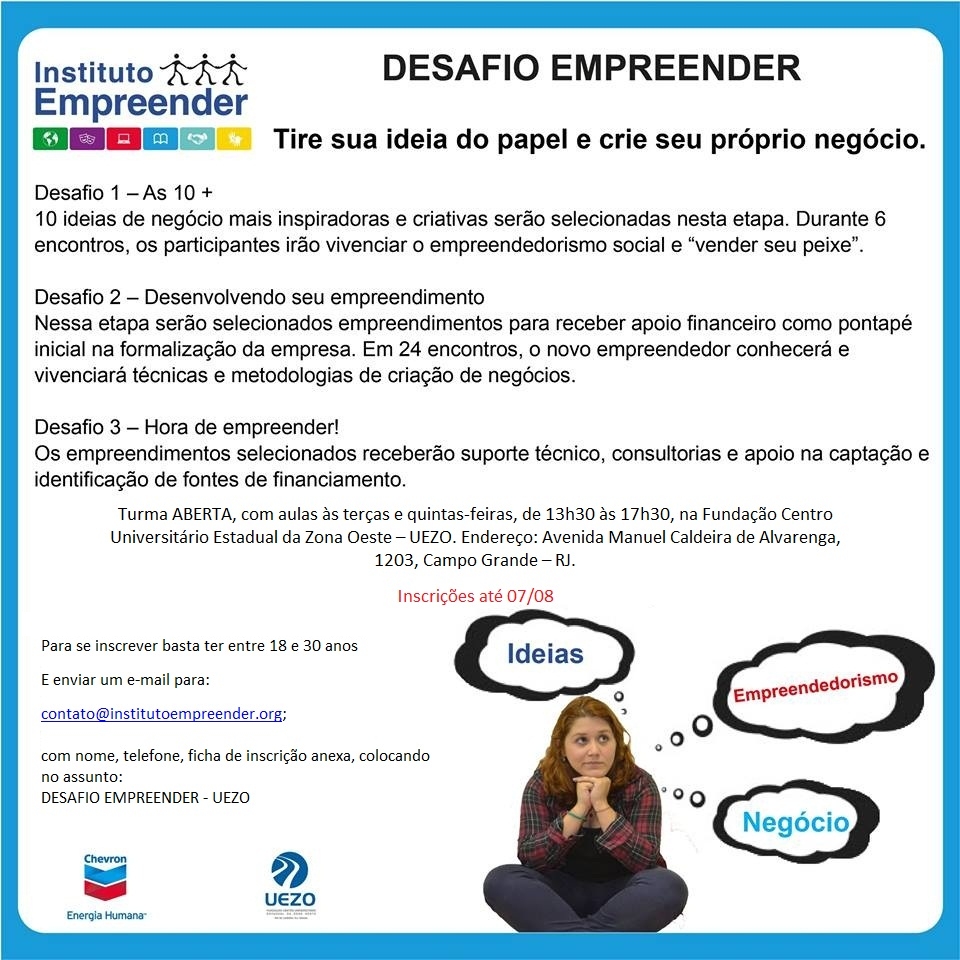 Denominado Desafio Empreender, o programa tem inscrições abertas até o dia 07 de agosto. Serão oferecidas aulas às terças e quintas, na UEZO, de 13h30 às 17h30. O curso é constituído por três etapas (confira o banner abaixo), voltadas para fornecer diversas ferramentas aos potenciais empreendedores.