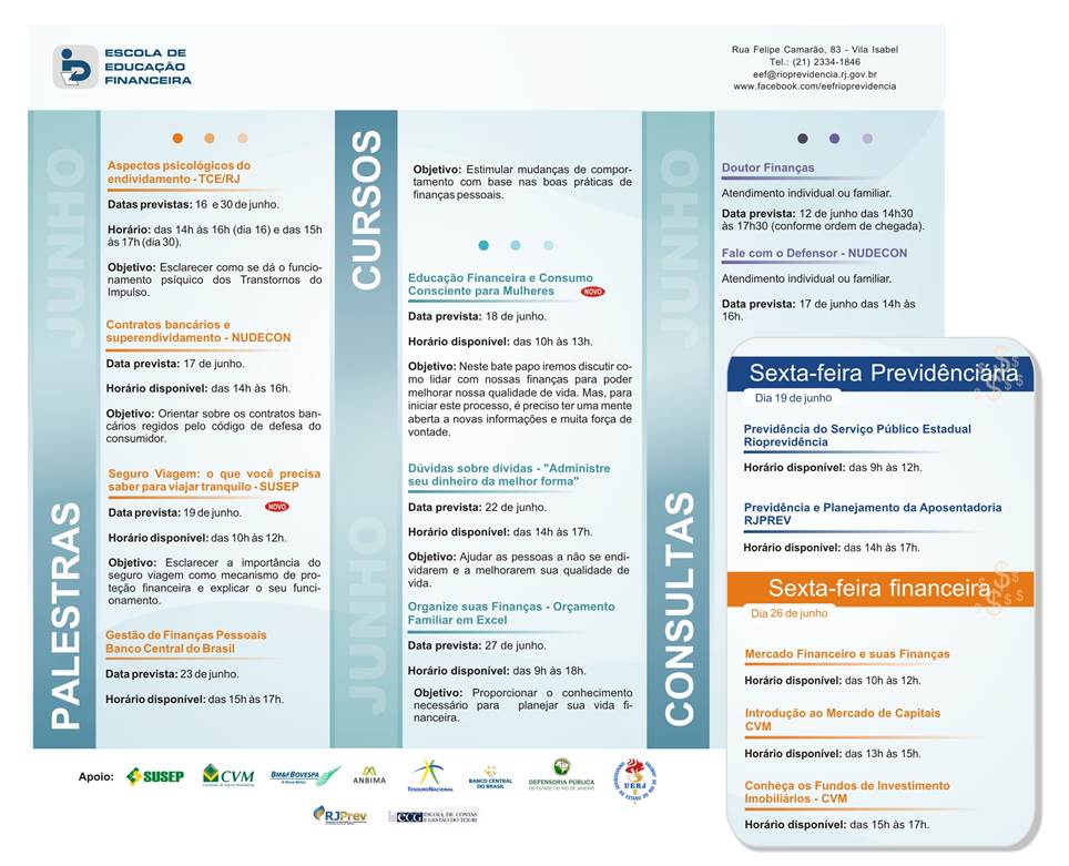 A Escola de Educação Financeira da Rioprevidência promoverá palestras, cursos e consultas sobre Educação Financeira neste mês de junho. Confira a programação: