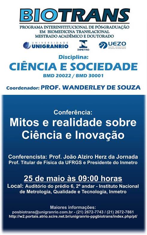 No dia 25 de maio, às 9h, será realizada a conferência “Mitos e realidade sobre Ciência e Inovação”, proferida pelo professor João Jornada, Presidente do Inmetro. A conferência abrirá a disciplina Ciência e Sociedade, ministrada pelo Prof. Wanderley de Souza, no âmbito do Programa Insterinstitucional de Pós-Graduação em Biomedicina Translacional, que reúne a UEZO, UNIGRANRIO e INMETRO.
