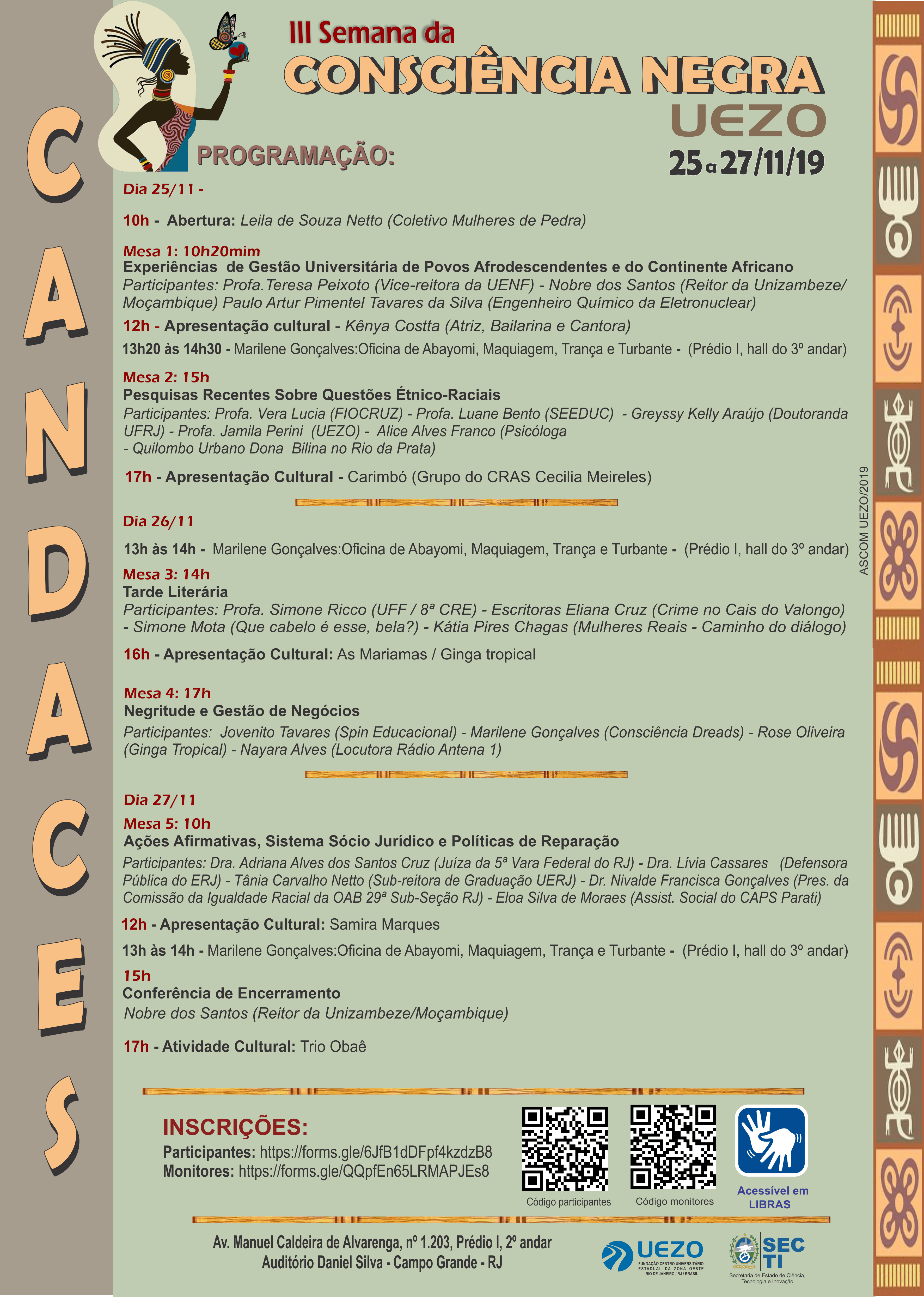A III Semana de Consciência Negra da UEZO acontece nos dias 25, 26 e 27 de novembro, com uma programação gratuita que inclui palestras, oficinas e apresentações culturais.