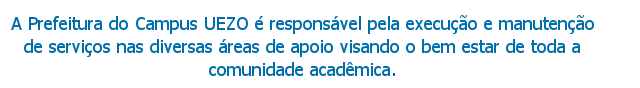 Ações da Prefeitura em 2017A Prefeitura tem trabalhado intensamente para melhor atender as demandas do campus. Para saber mais sobre o que tem sido feito, clique no link a seguir. PRINCIPAIS AÇÕES DA PREFEITURA NO PRIMEIRO TRIMESTRE DA GESTÃO NotíciasPor Prefeitura da UEZO Informe Prefeitura UEZODevido às obras de reforma no telhado que cobre as salas: 104,105, almoxarifado, refeitório dos alunos e sala de convivência, o uso do estacionamento próximo a este prédio fica proibido no período de aproximadamente 60 dias.