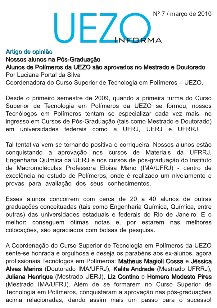 Informativo UEZO nº 07 – Nossos alunos na Pós-graduação